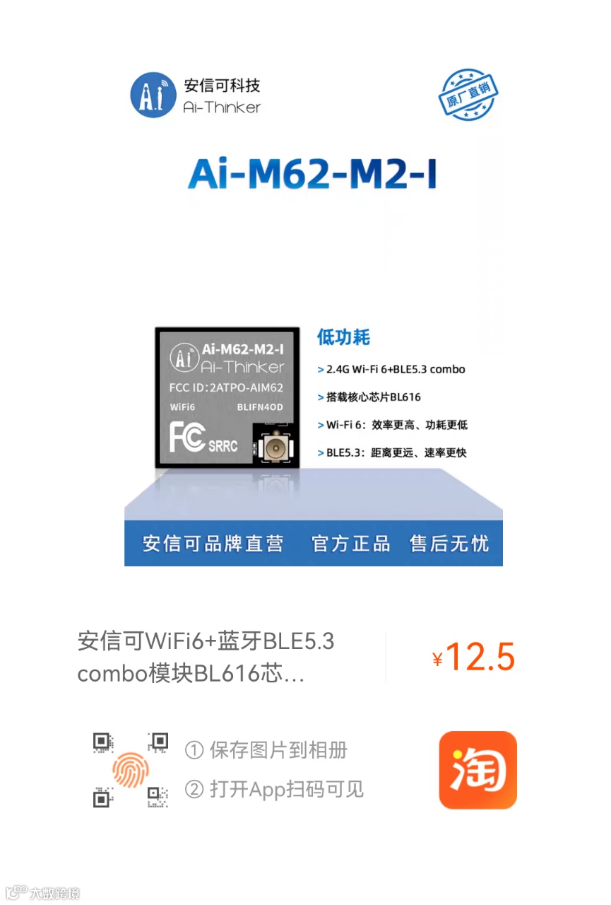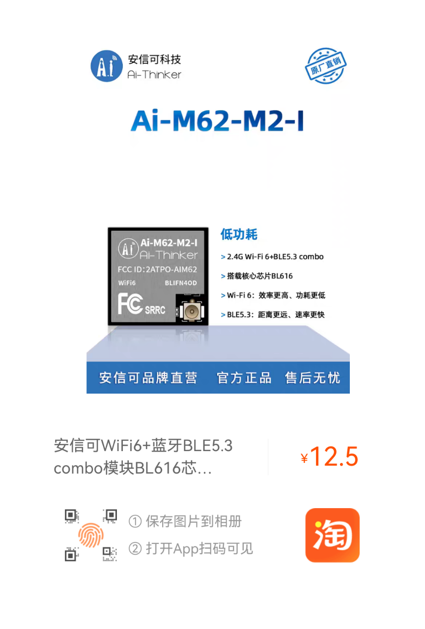 Ai-M62-M2-I 是由安信可科技开发的Wi-Fi 6+BLE5.3 模组,该模组搭载BL616 芯片作为核心处理器,支持 Wi-Fi 802.11b/g/n/ax 协议和BLE 协议,支持Thread协议。