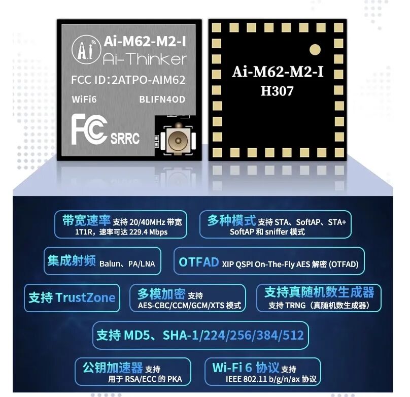 随着Wi-Fi标准的演进,Wi-Fi6已走向大规模商用阶段。去年通过长期研发设计及反复打磨,安信可推出WiFi 6+BLE5.3+X模组——Ai-M61和Ai-M62系列模组。今年再度上新Ai-M62-M2-I,小尺寸,Wi-Fi 6+BLE5.3满足客户高带宽、低功耗等产品需求。