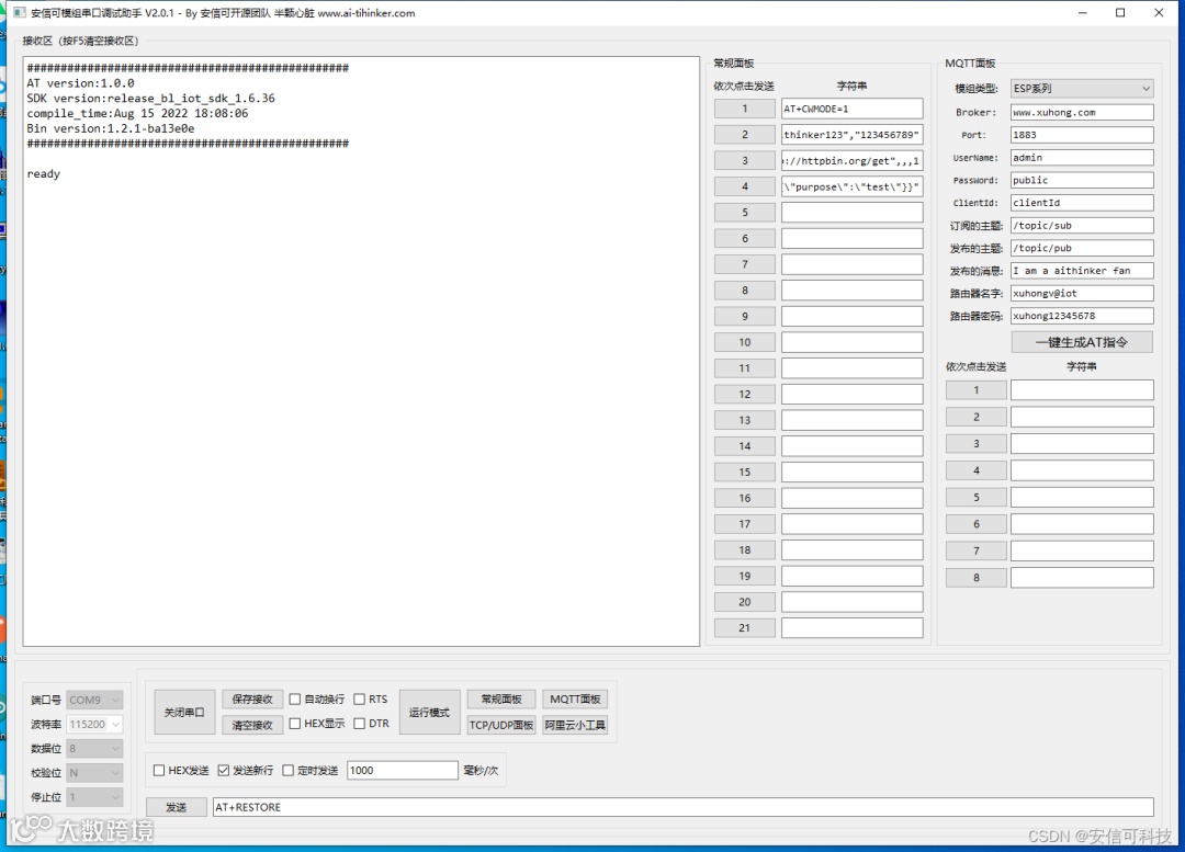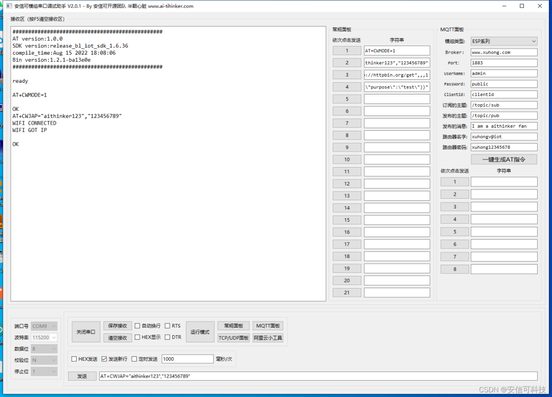 发送AT+CWMODE=1;AT+CWJAP=“WIFI名称”,“WIFI密码”,比如我现在测试的WIFI名称为aithinker123,密码为123456789,如下图:
