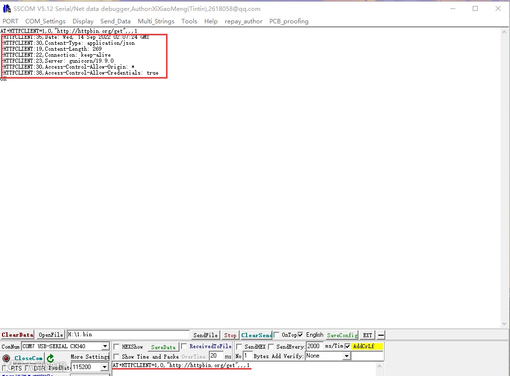 命令:AT+HTTPCLIENT=1,0,“http://httpbin.org/get”,1