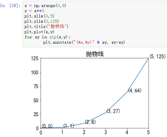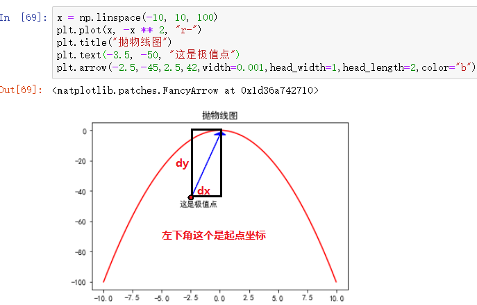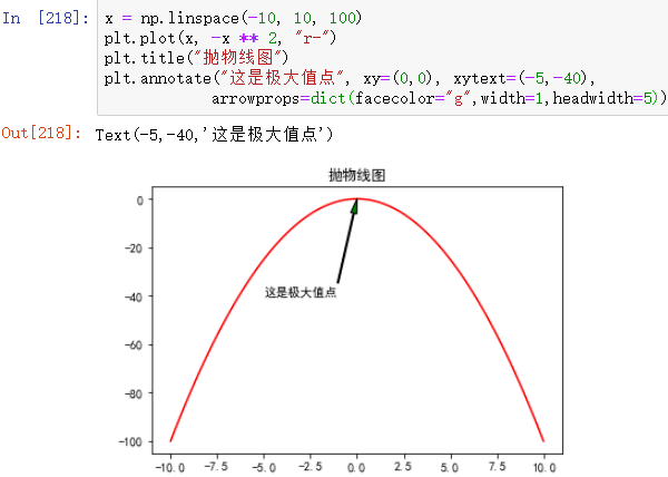 plt.annotate(“这是极大值点”, xy=(0,0), xytext=(-5,-40),
