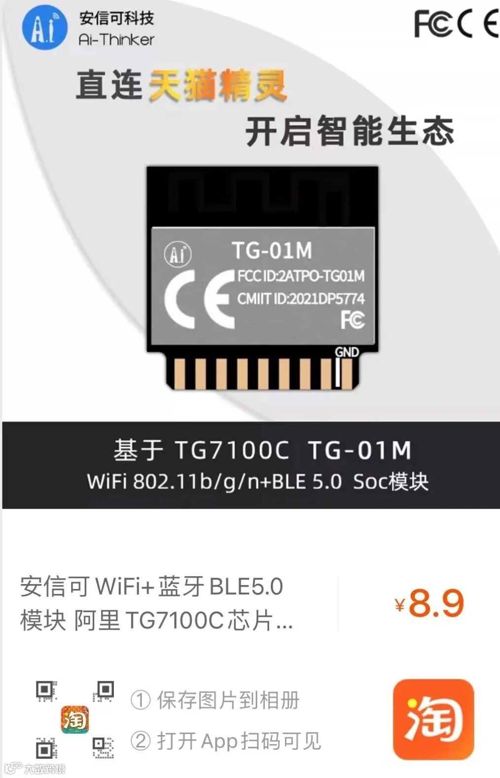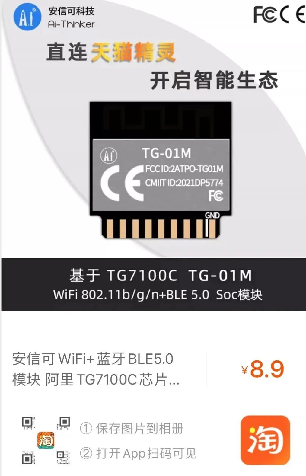 TG-12F/01M 是一款基于天猫精灵 TG7100C WiFi+BLE 芯片开发的模组,模组内置2MB Flash,芯片内置276 KB SRAM,128 KB ROM;采用 2.4G WiFi 802.11b/g/n 和 BLE5.0 基带/MAC 模块设计,具有高性能、低成本、敏捷开发的特性。适用于低功耗和高性能类应用开发,可直连天猫精灵的一站式解决方案。