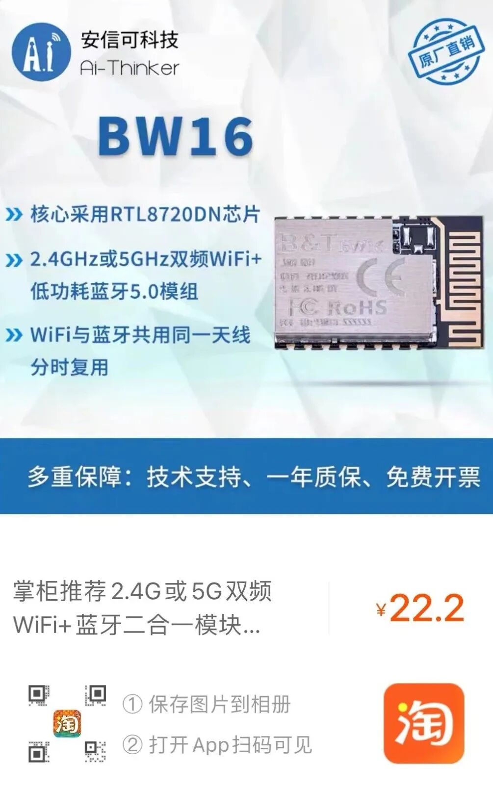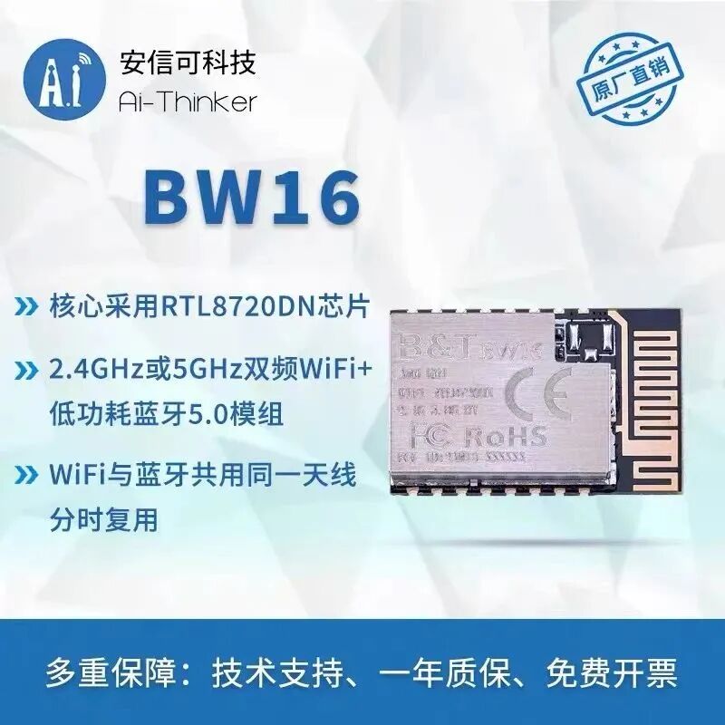 BW16 同时集成了内部存储器,支持简单的应用程序开发,可实现完整的 Wi-Fi 和 BLE 5.0 协议功能。