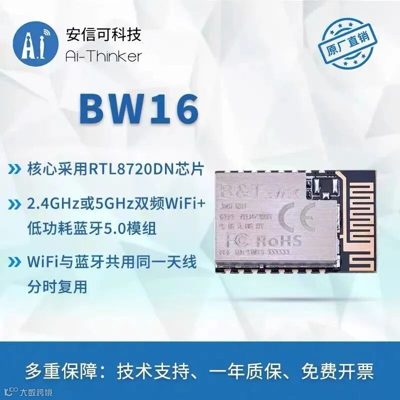 BW16是基于 RTL8720DN开发的双频Wi-Fi+蓝牙SoC模组。BW16支持双频(2.4GHz 或 5.8GHz)WLAN和低功耗蓝牙5.0;它集成了ARM V8(兼容 Cortex-M4F)高性能 MCU、ARM V8M(兼容 Cortex-M0)低功耗 MCU、WLAN(802.11 a / b / g / n)、MAC,蓝牙基带和 RF 基带,并提供了一组可配置的 GPIO 口,用于不同外围设备的控制。