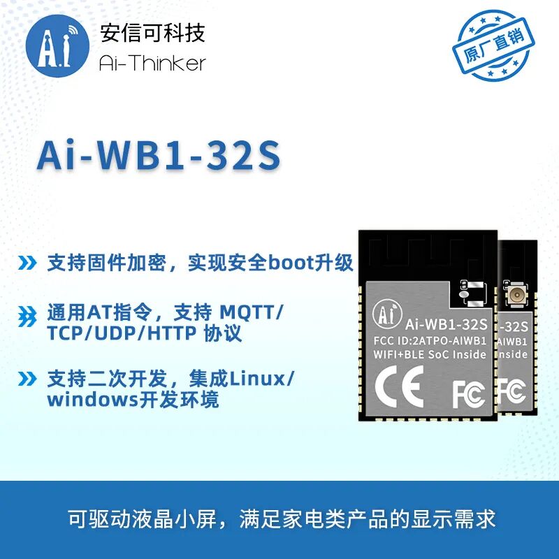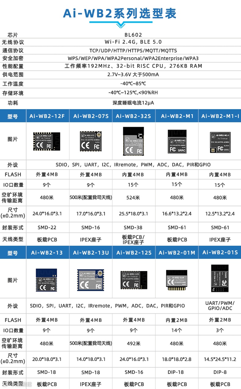Ai-WB2系列模组产品:延续兼容安信可10种经典模组封装,如Ai-WB2-01M模组采用DIP-18封装形式;Ai-WB2-01S模组使用DIP-8封装形式;Ai-WB2-07S模组采用SMD-16形式;Ai-WB2-12F/05W模组采用SMD-22,Ai-WB2-12S模组采用SMD-16;Ai-WB2-13/13U模组采用SMD-18封装形式;Ai-WB2-32S模组采用SMD-38封装形式;Ai-WB2-M1/M1-I模组采用SMD-61封装形式;便于硬件做快速切换。