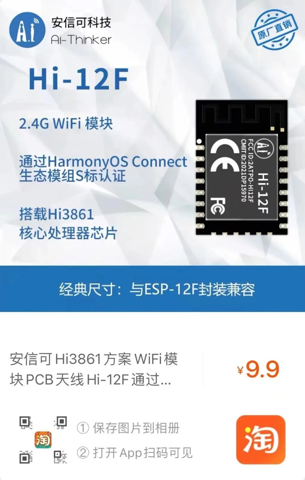 Hi-12F模组搭载华为海思Hi3861芯片,目前已过HarmonyOS Connect生态模组认证;