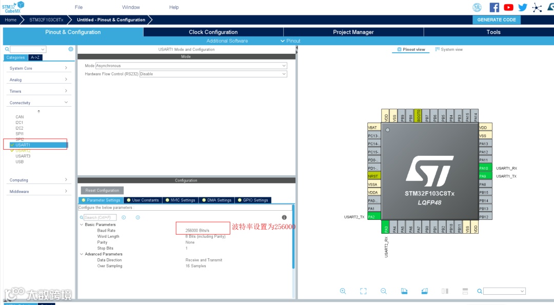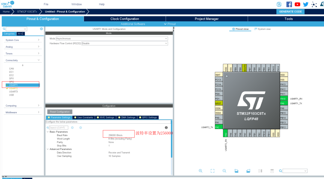 选择异步通讯,勾选中断,注意:串口1的波特率为256000,串口2波特率为115200。