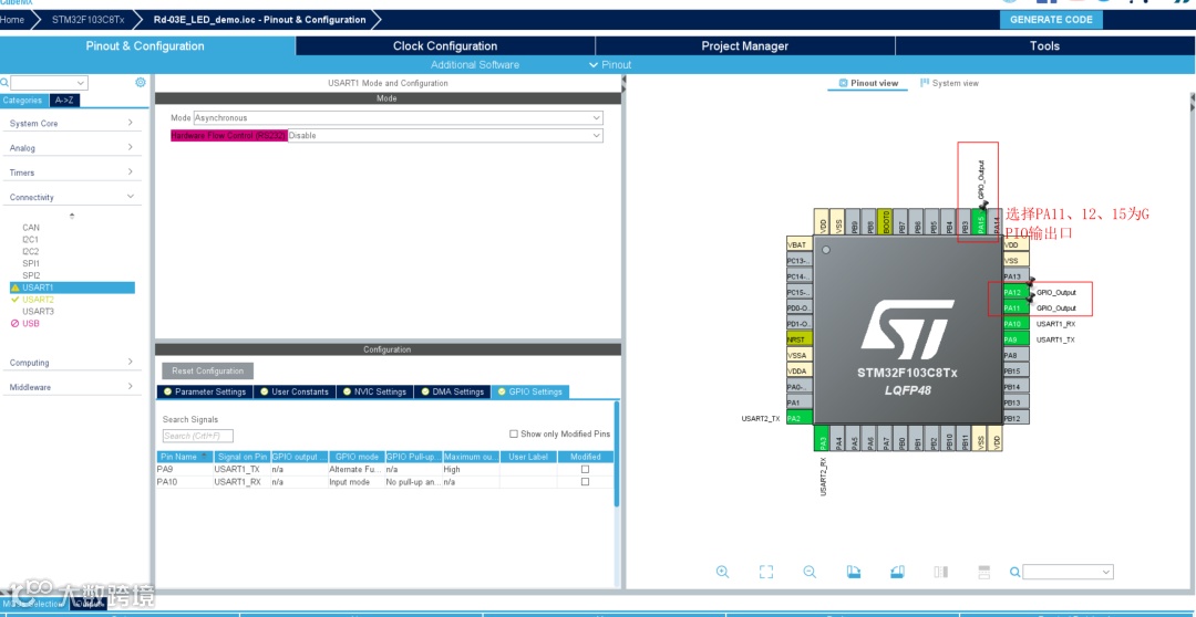 选择两个串口,分别是串口1和串口2,PA9为USART1_TX,PA10为USART1_RX,PA2为USART2_TX,PA3为USART_RX。