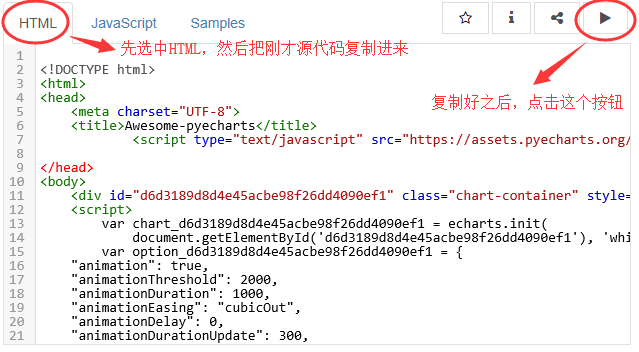 等加载好了之后,我们点击上面“HTML”模块,复制代码,然后点击右上角长得有点像播放键的按钮:
