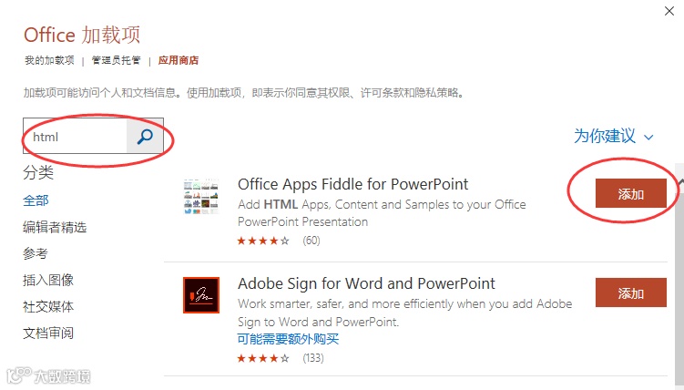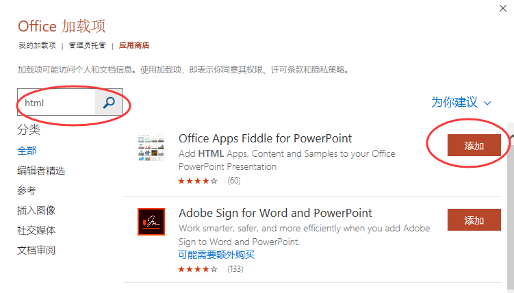 然后在加载项搜索框输入“html”,添加第一个结果“Office Apps Fiddle for PowerPoint”: