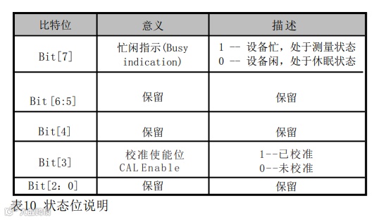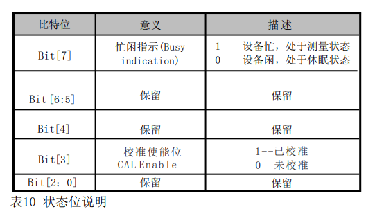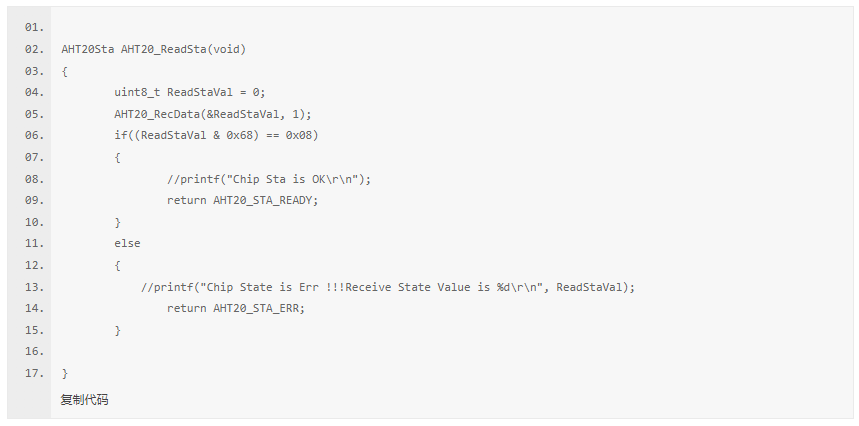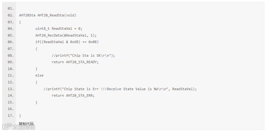 其中表中说明接收的数据为一个字节,bit[3]为校准使能位,该位说明AHT20芯片是否校准过,一般在出厂后都是进行校准过的,校准后该位便一直为1;bit[7]为AHT20状态位,这位比较重要,说明数据是否采集成功,只有数据采集成功后,设备处于空闲状态,该位为0,表明可以读取数据。在这里可以先写一个返回值判断的函数,函数代码如下: