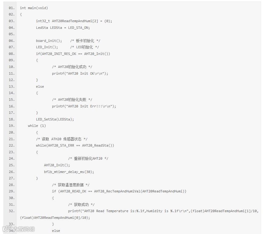 main函数的主要功能是1S通过AHT20读取一下温湿度值,若读取成功则通过打印输出温湿度值。通过绿灯频率为1S的闪烁告知MCU正常运行。