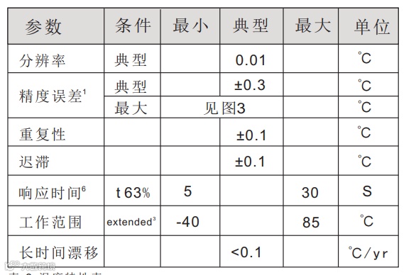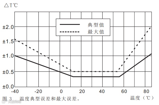 上图中显示精度误差典型值为±0.3,可见其精度值可以满足一些常见的开发需求的。工作范围-40至80℃也是和MCU(一般是-40至85℃)基本一致的。