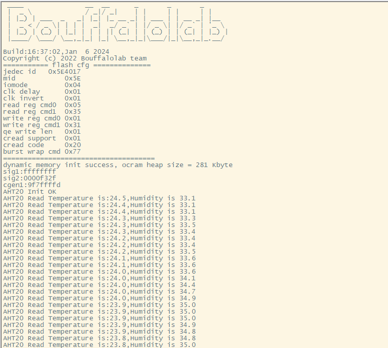 通过串口软件可以查看MCU的运行状态和读取到的温湿度值。MCU正常运行和正常读取到温湿度值的打印状态如下图所示: