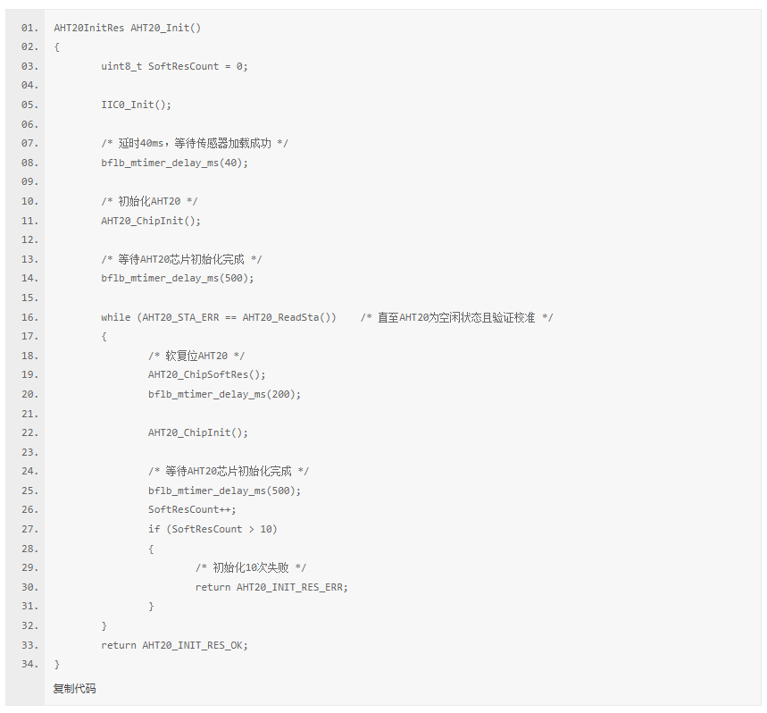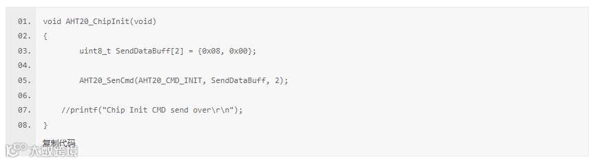 AHT20上电后也要做一些初始化操作,主要是发送初始化指令和判断AHT20的状态。AHT20的初始化函数定义如下: