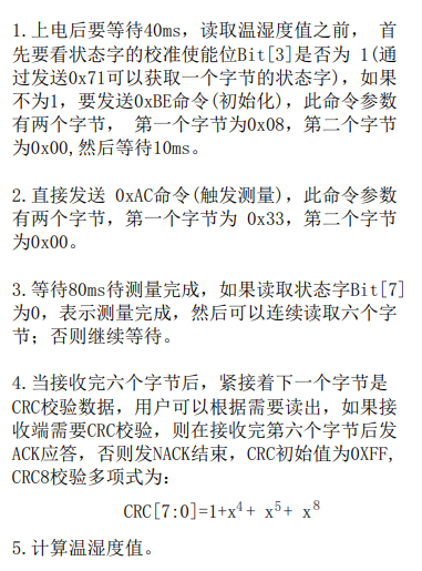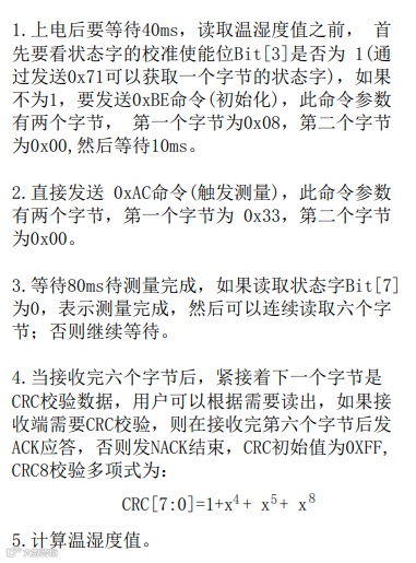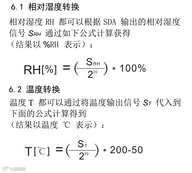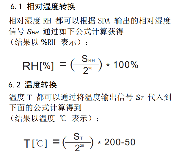 根据转换公式,将读取到的数据转换为温湿度。转换后的温湿度都是放大10,即保留了一个小数。温湿度转换公式如下: