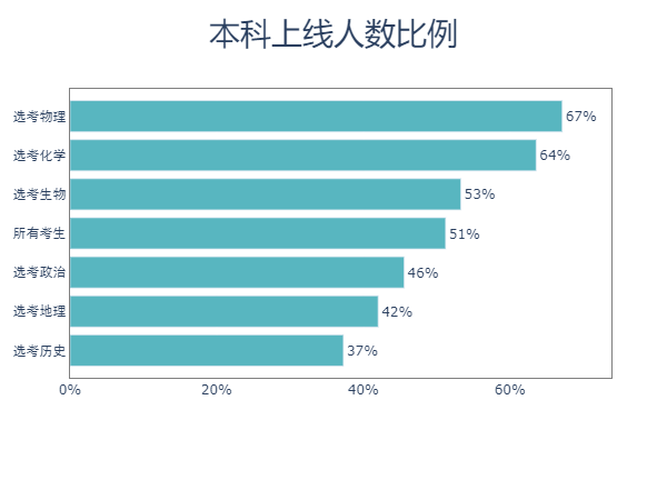 通过计算各科所有选择的人中有多少人的总分在一段线以上,发现,选考物理的学生的上线率最高,达到了67%,而选考历史的学生的上线率较低,只有37%。