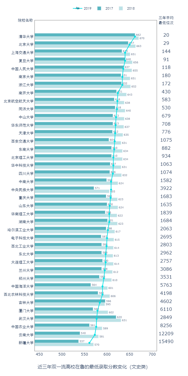 我们统计了近三年双一流高校在山东的文史类专业录取最低分,位次靠前的依次是清华大学,北京大学,上海交通大学,复旦大学,中国人民大学。