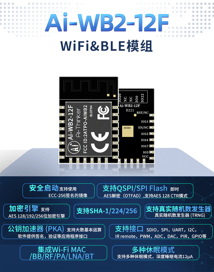 安信可Ai-WB2系列模组支持WiFi+BLE,可以满足不同的物联网应用场景。此外,模组还具有高度安全性,可以保护您的数据安全,并确保数据传输的完整性。