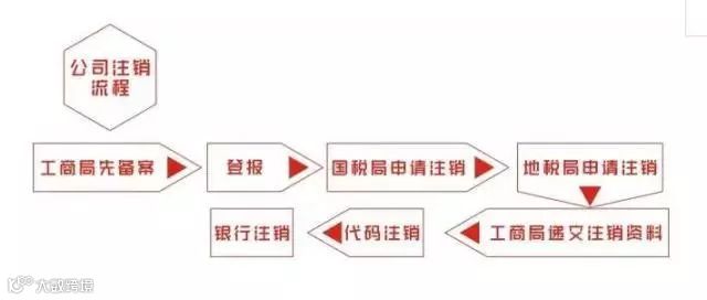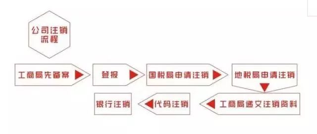 工商局先备案 → 登报 → 国税局申请注销 → 地税局申请注销 → 工商局递交注销资料 →代码注销 → 银行注销