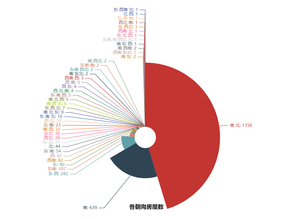 由玫瑰图可以看出,南北朝向的房屋数最多,有1358间房源,占比总数近一半,其次是南朝向的房屋数量也较多。