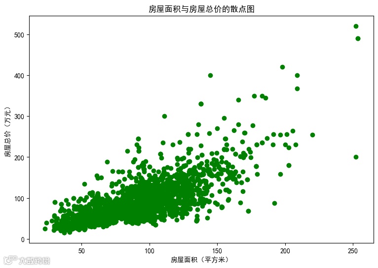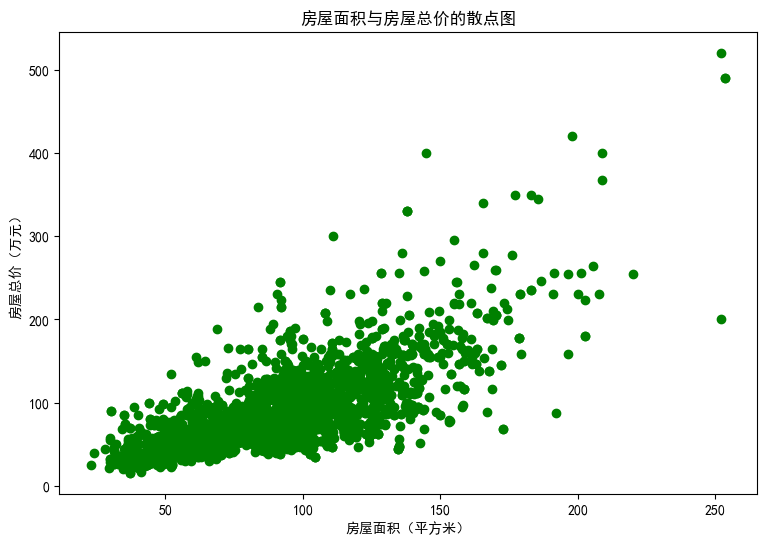import matplotlib.pyplot as plt # 导入 matplotlib.pyplot 用于绘图plt.rcParams['font.sans-serif']=['SimHei'] #用来正常显示中文标签plt.rcParams['axes.unicode_minus']=False #用来正常显示负号# 生成散点图plt.figure(figsize=(9, 6))plt.scatter(df['房屋面积(平方米)'], df['房屋总价(万元)'], color='green')plt.title("房屋面积与房屋总价的散点图")plt.xlabel("房屋面积(平方米)")plt.ylabel("房屋总价(万元)")# 显示图表plt.show()