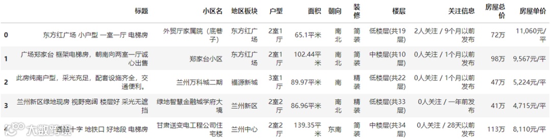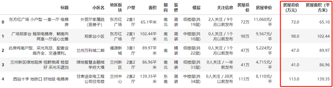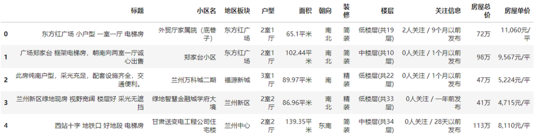 # 删除字段中的文字和标点符号,保留其数字,并转换成数字类型df['房屋总价(万元)'] = df['房屋总价'].str.extract(r'(\d+\.?\d*)').astype(float)# 删除字段中的文字和标点符号,保留其数字,并转换成数字类型df['房屋面积(平方米)'] = df['面积'].str.extract(r'(\d+\.?\d*)').astype(float)#数据处理后的结果df.head()