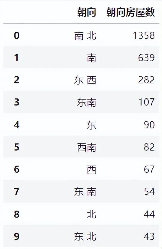 # 重新统计'朝向'分组的条目数作为朝向房屋数orientation_counts = df['朝向'].value_counts().reset_index()orientation_counts.columns = ['朝向', '朝向房屋数']orientation_counts.head()