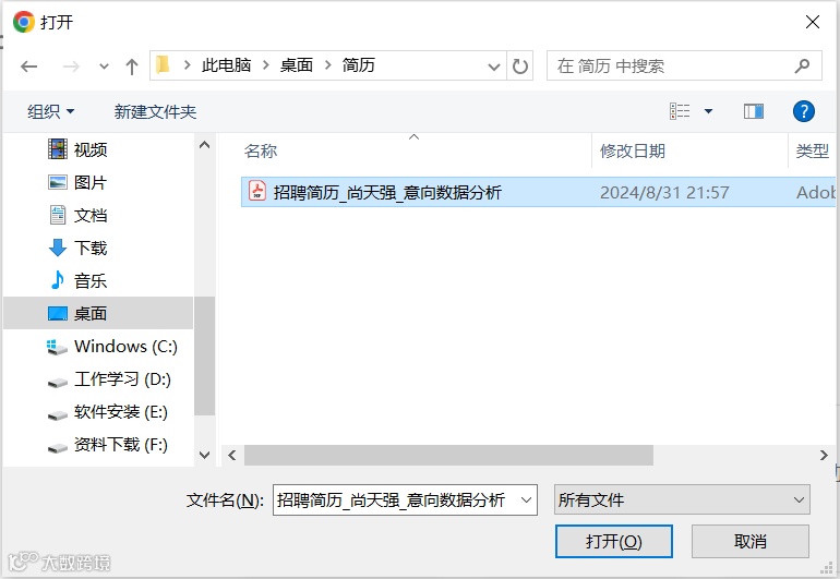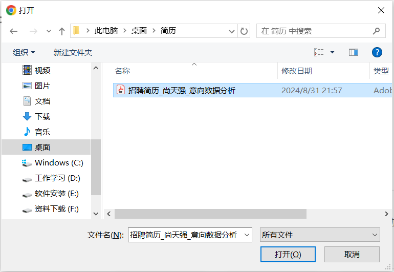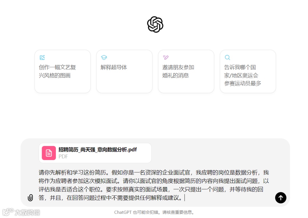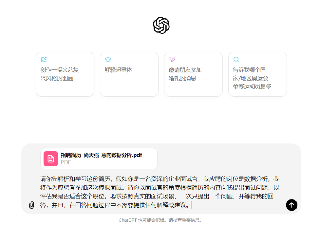 这里我们首先借助ChatGPT将简历进行解析,以我的简历为例,通过文件链接按钮将我的简历上传至ChatGPT。