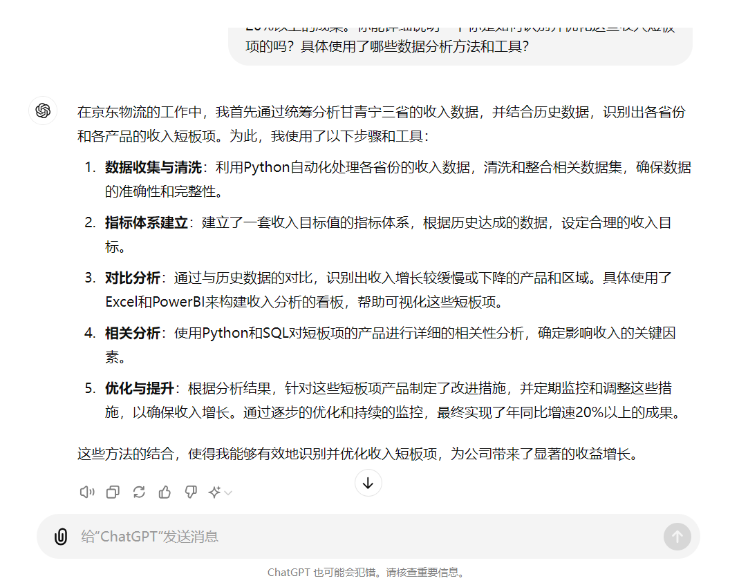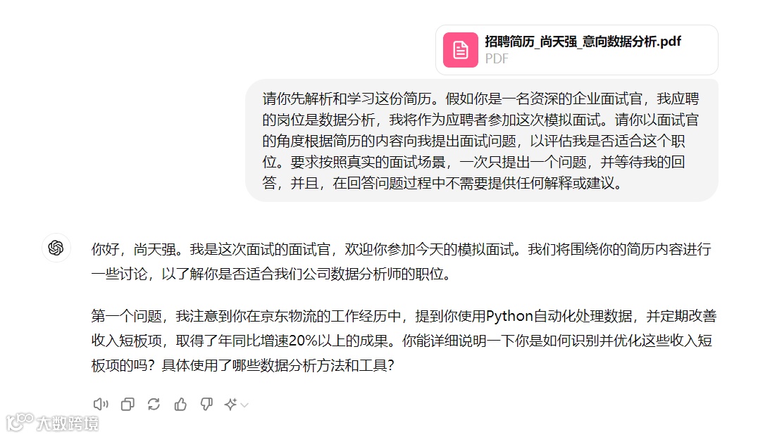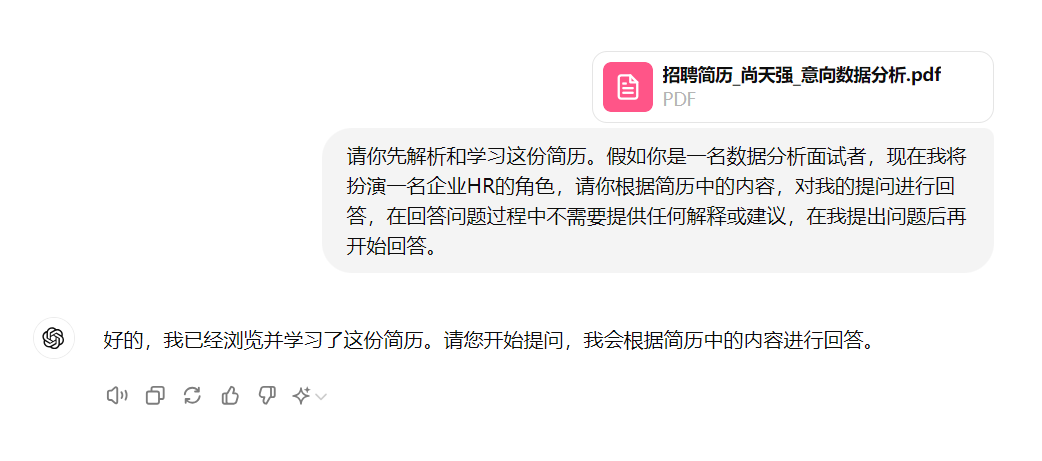 接着我们可以使用AI解析简历,并且根据前文AI面试官提出的问题,再次使用AI进行解答,我的提问如下: