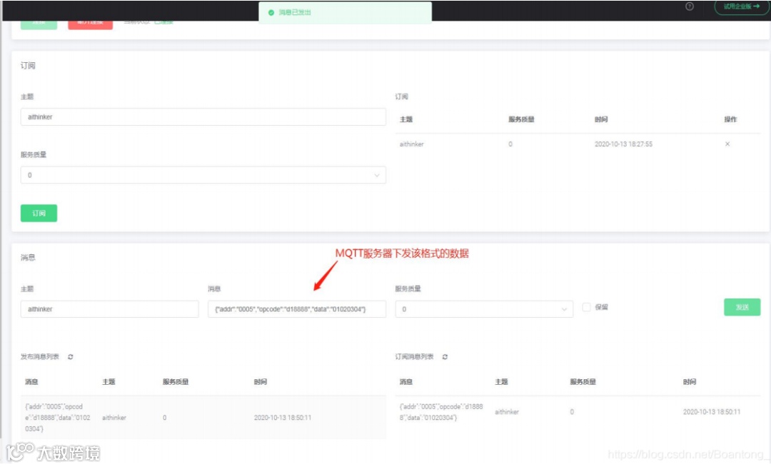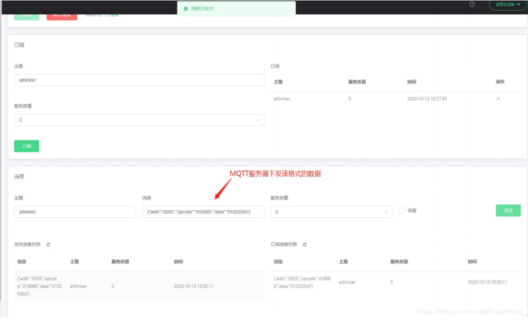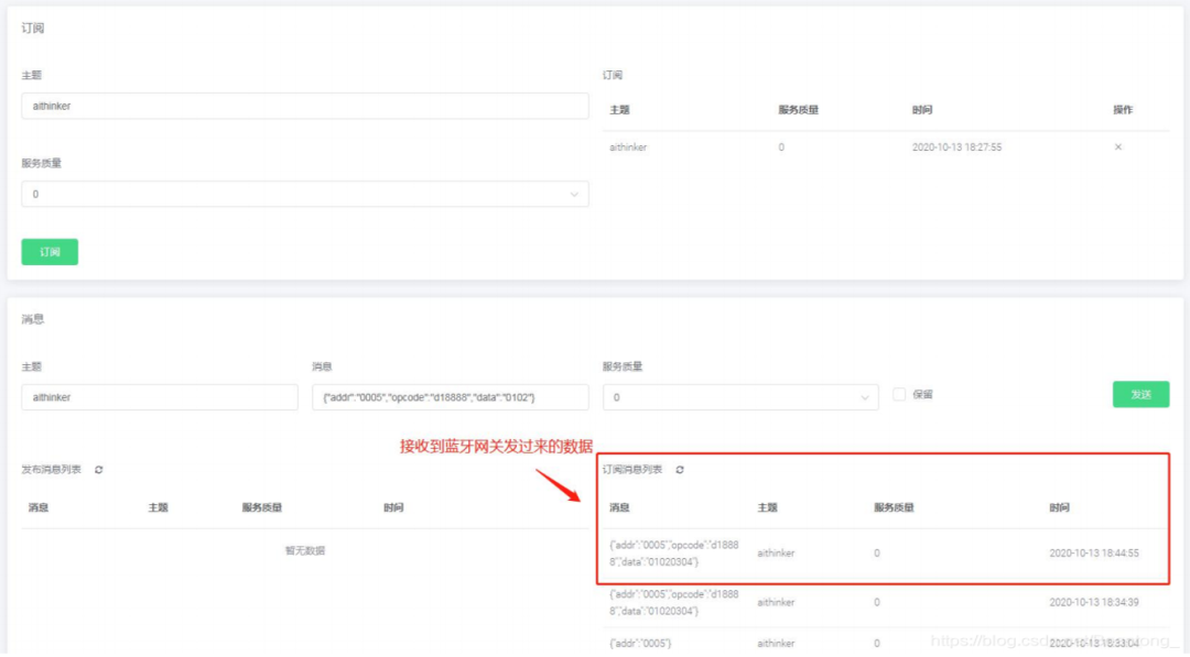 蓝牙网关收到数据后,再将该数据转发到 MQTT 服务器中,如下图