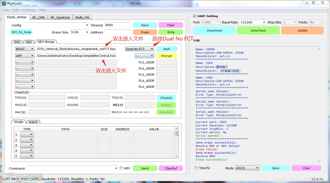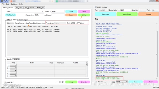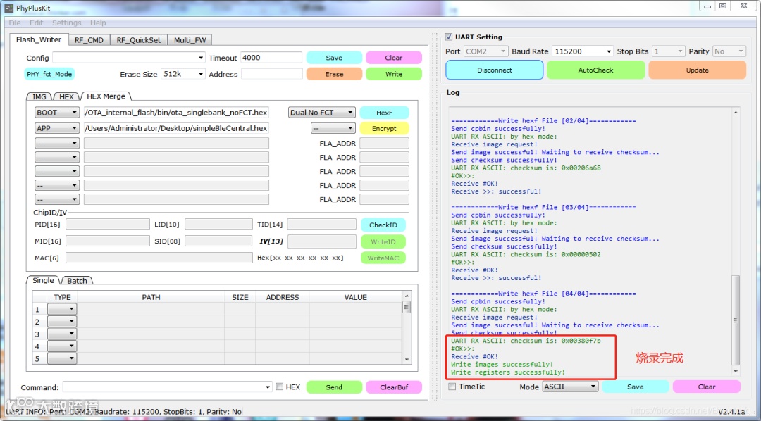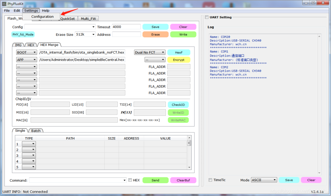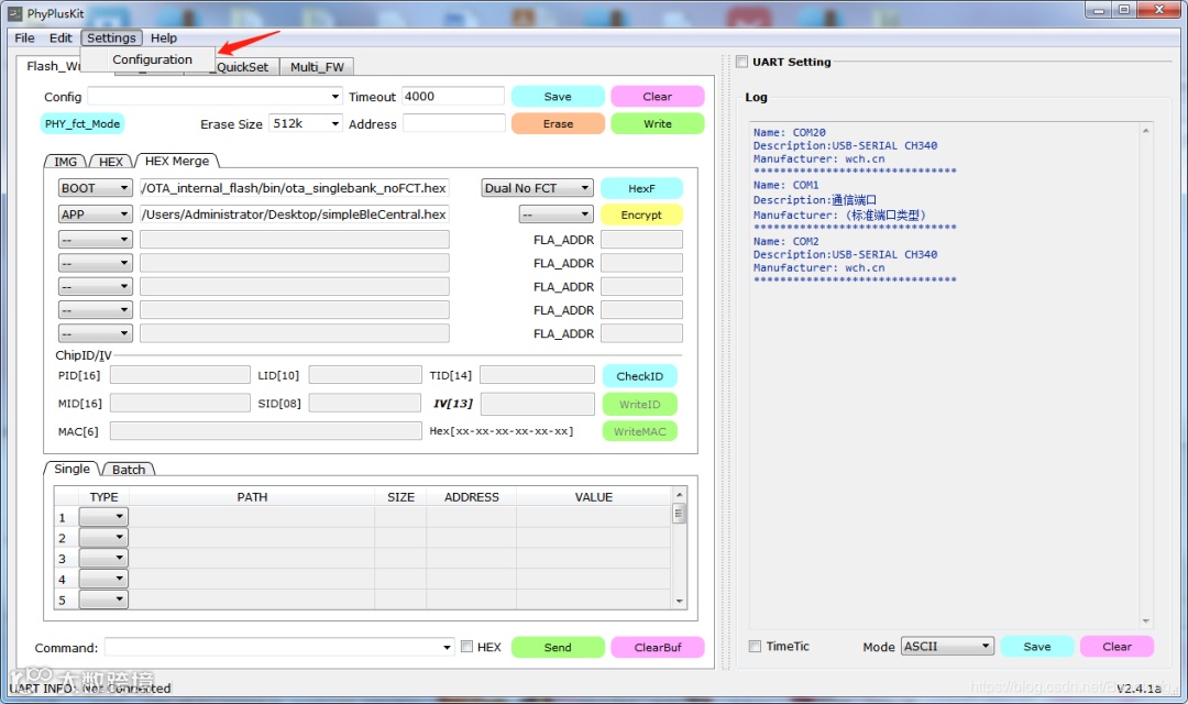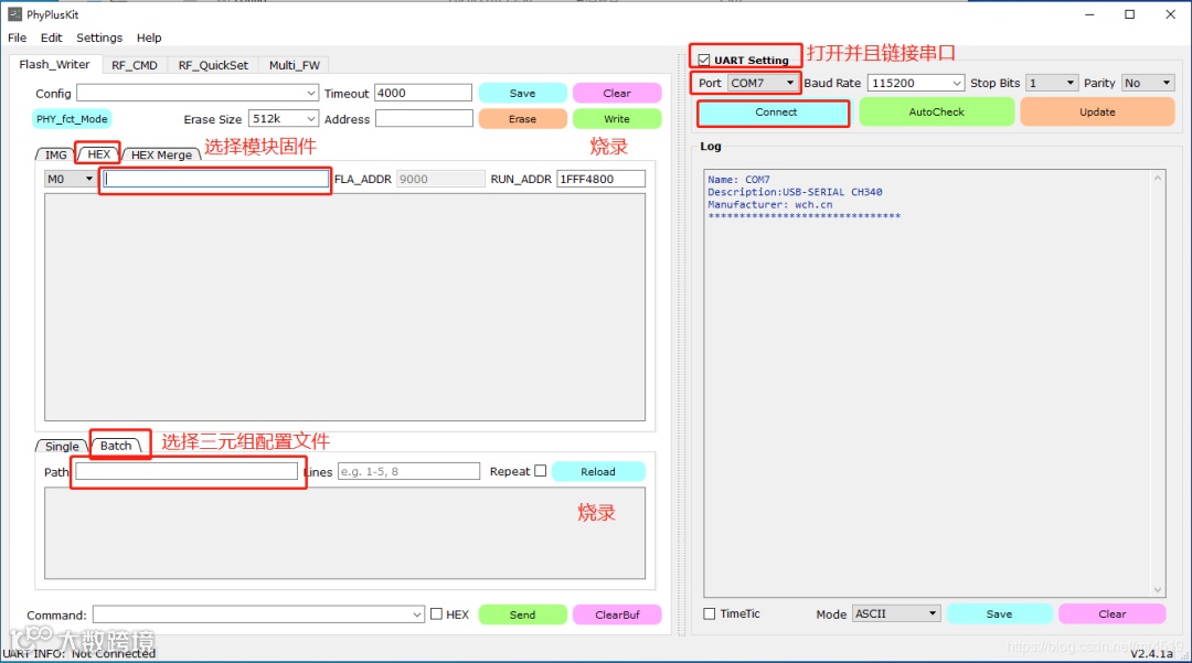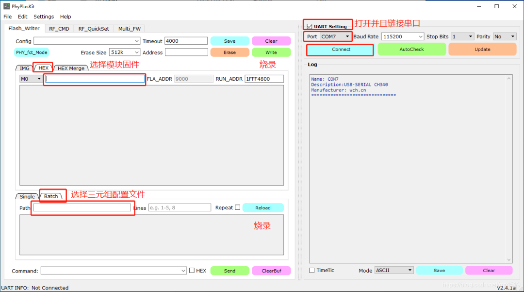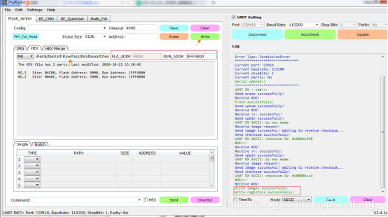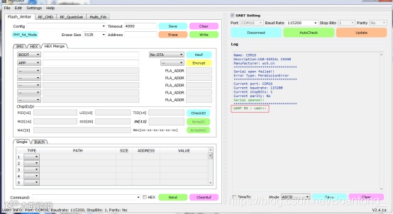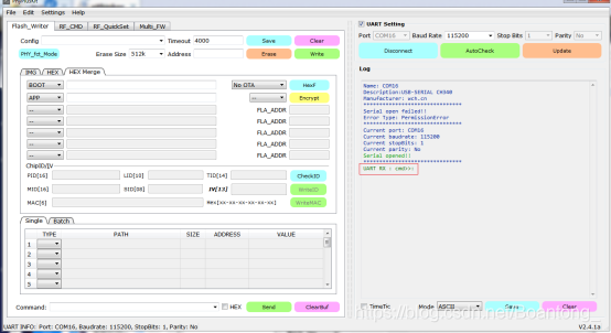 先对PhyPlusKit工具进行设置:同时按下RST和PROG按键,出现UART RX : cmd>>:信息,则表示进入了烧录模式。