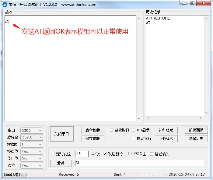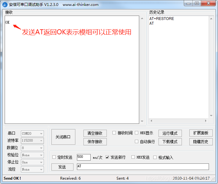 发送AT返回OK,表示模组可以正常使用。
