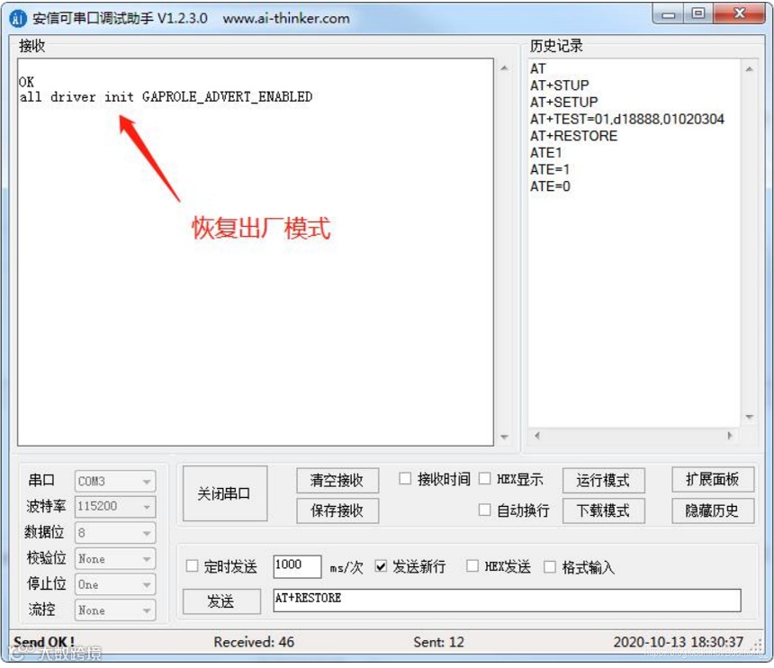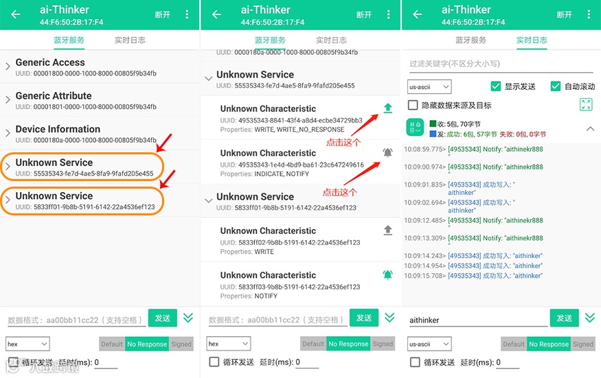 模组上电后会广播默认名称为 “Ai-Thinker”的蓝牙设备,手机通过APP连接并开启notify后即可与模块相互通讯,通过串口调试助手验证这一步操作,如图所示。