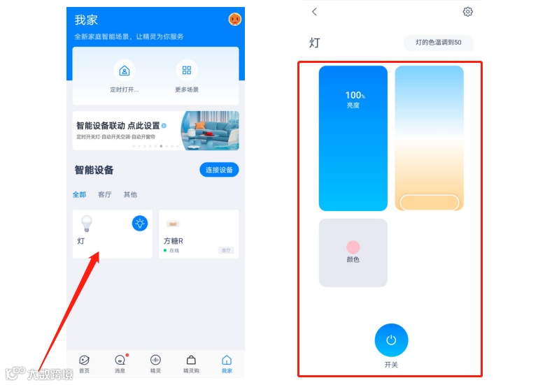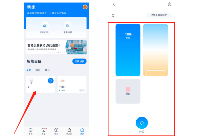 打开天猫精灵APP,通过拨动如下图中的按钮和滑块可以实现灯的智能控制。