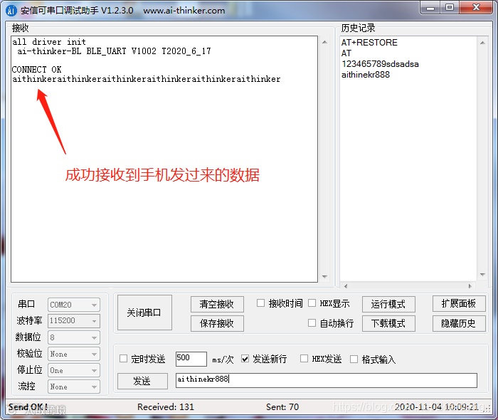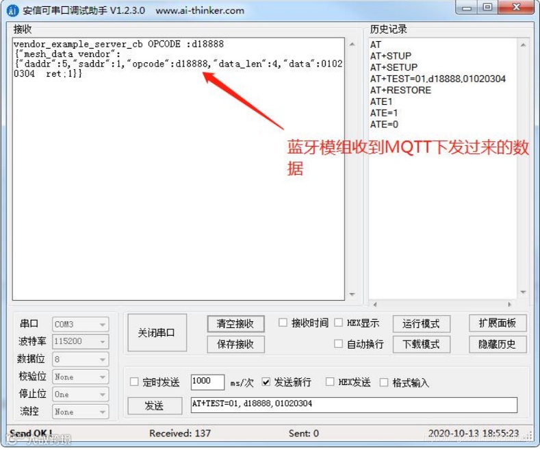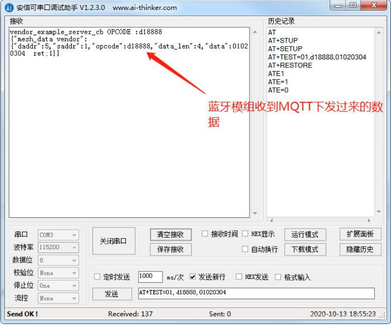 蓝牙网关将数据转发到蓝牙模组上,蓝牙模组成功收到数据,如下图所示