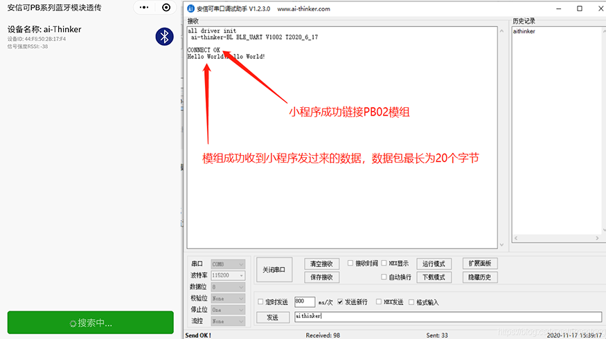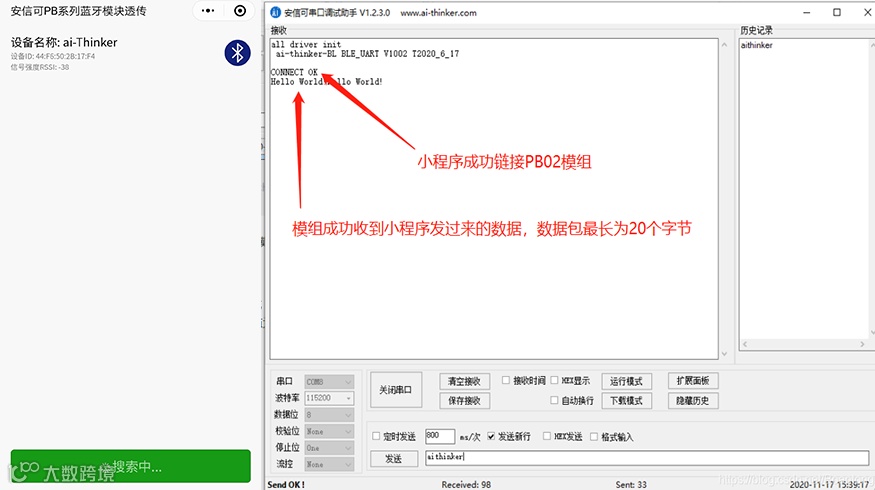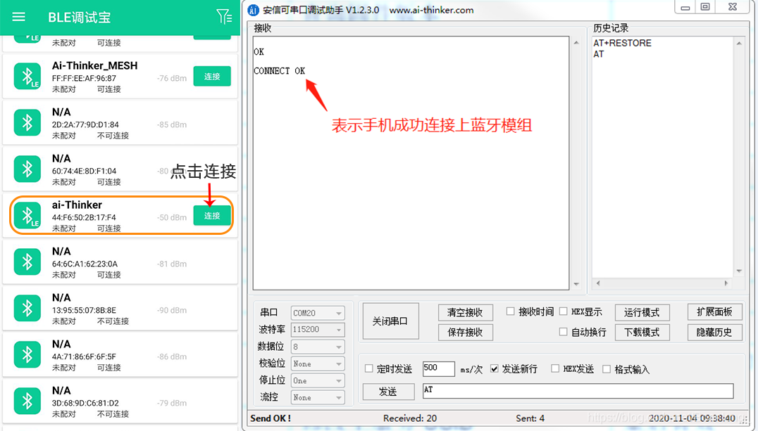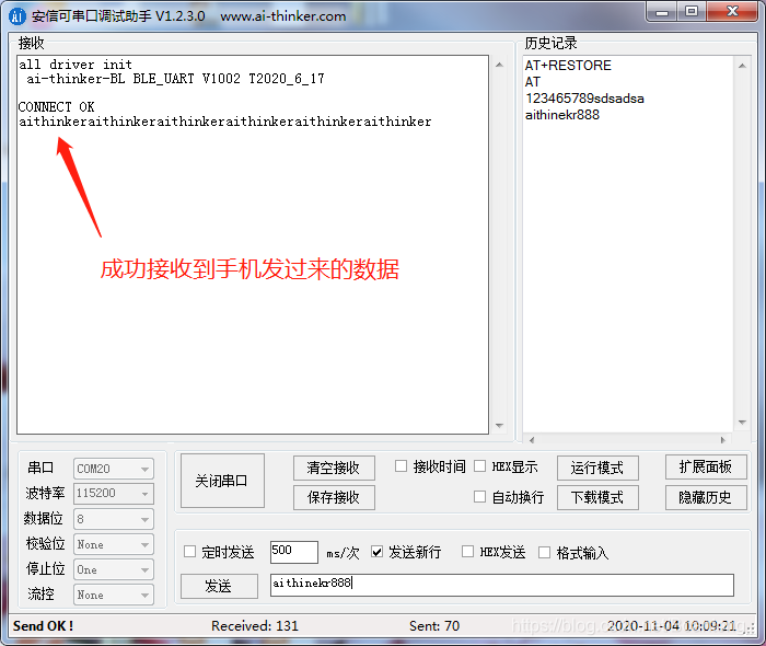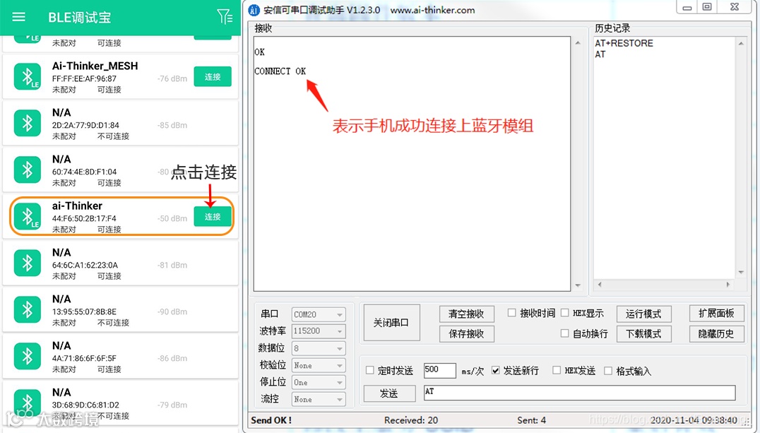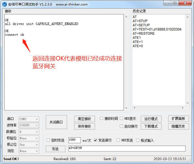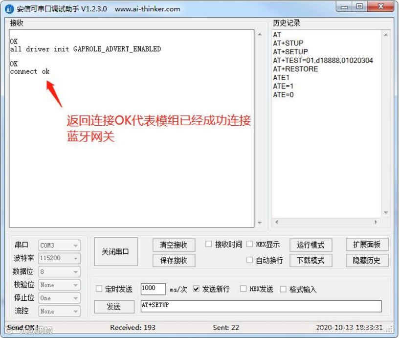 成功连接后,蓝牙模块会打印 connect ok,如下图