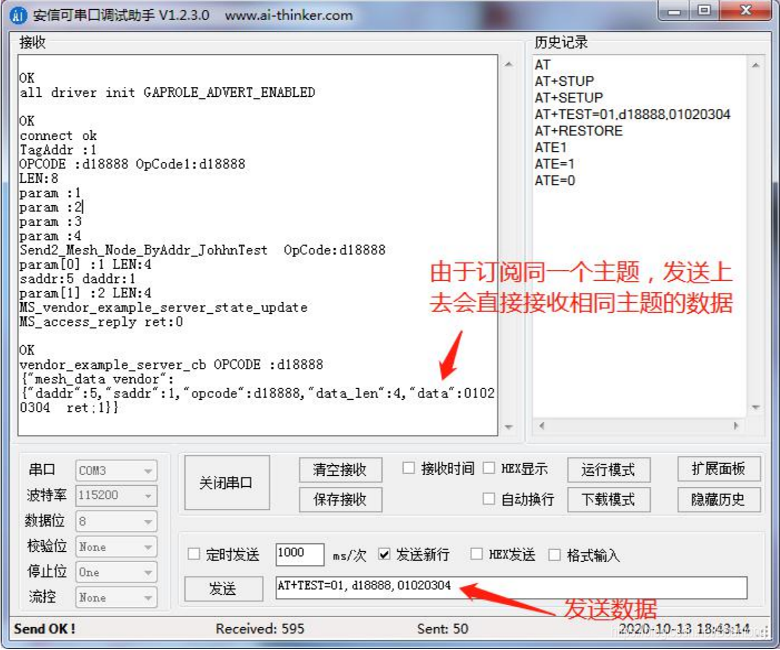 由于订阅同一个主题,发送上去会直接接收相同主题的数据。