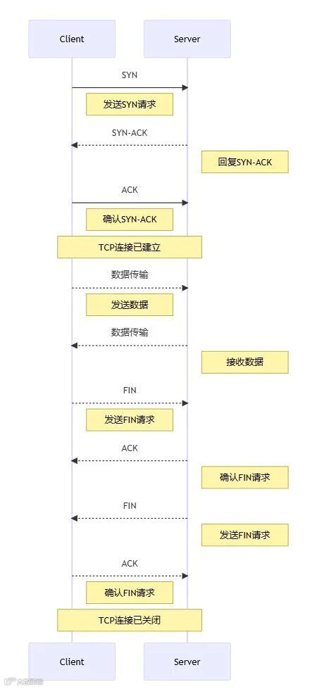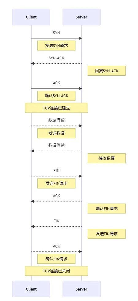 sequenceDiagramparticipant Clientparticipant ServerClient ->> Server:SYNnote right of Client:发送SYN请求Server -->> Client:SYN-ACKnote right of Server:回复SYN-ACKClient ->> Server:ACKnote right of Client:确认SYN-ACKnote over Client,Server:TCP连接已建立Client -->> Server:数据传输note right of Client:发送数据Server -->> Client:数据传输note right of Server:接收数据Client -->> Server:FINnote right of Client:发送FIN请求Server -->> Client:ACKnote right of Server:确认FIN请求Server -->> Client:FINnote right of Server:发送FIN请求Client -->> Server:ACKnote right of Client:确认FIN请求note over Client,Server:TCP连接已关闭