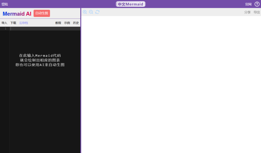 然后,打开Mermaid网站,这里先介绍一下什么是Mermaid?Mermaid 是一种基于文本的图表绘制工具,它允许用户使用简单的文本和代码来创建流程图、序列图、甘特图等,也就是说只要有支持Mermaid格式的代码,就可以生成图表。