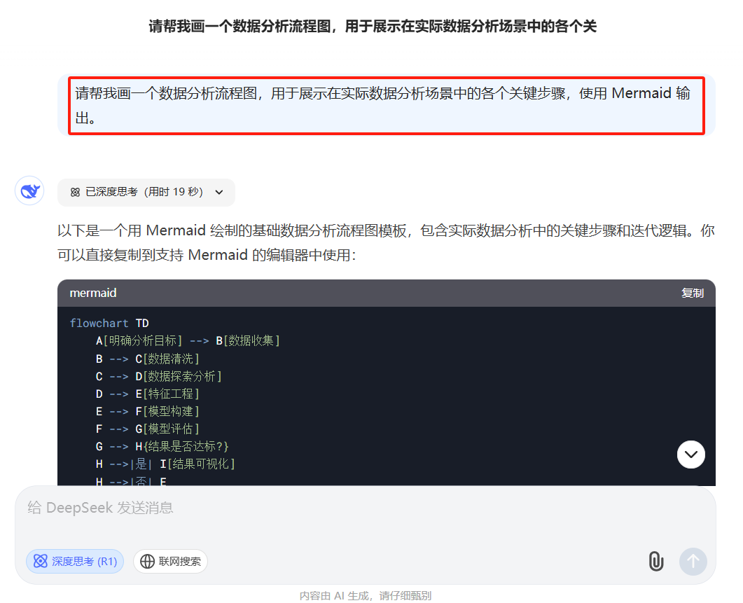 DeepSeek中很快就给出了Mermaid的代码,如下所示。