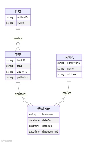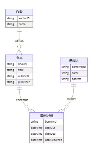 erDiagram"书本" {string bookIDstring titlestring authorIDstring publisher}"作者" {string authorIDstring name}"借阅人" {string borrowerIDstring namestring address}"借阅记录" {string borrowIDdatetime dateOutdatetime dateDuedatetime dateReturned}"作者" ||--o{ "书本" : "writes""书本" ||--o{ "借阅记录" : "contains""借阅人" ||--o{ "借阅记录" : "makes"
