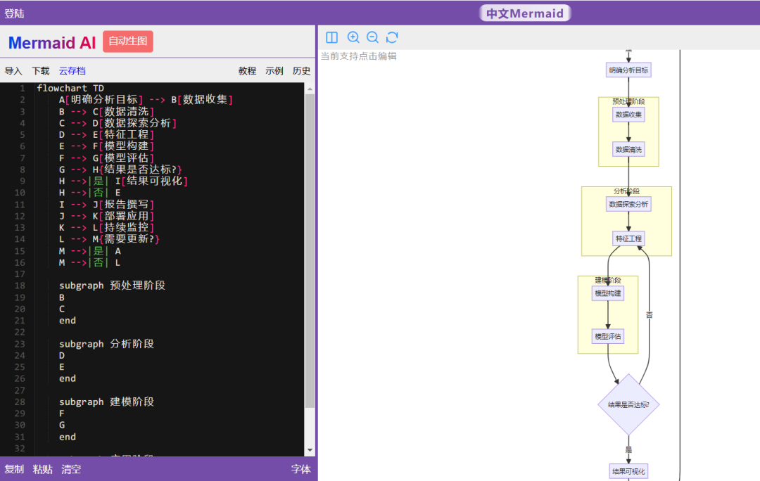 只需要将前文DeepSeek生成的Mermaid代码粘贴到中文Mermaid网站,即可一键生成流程图,生成的流程图如右边所示,虽然制作图表很简单,但是,需要注意的是在与DeepSeek对话的时候,一定要以Mermaid的格式输出,这是对话提示词中的重中之重。