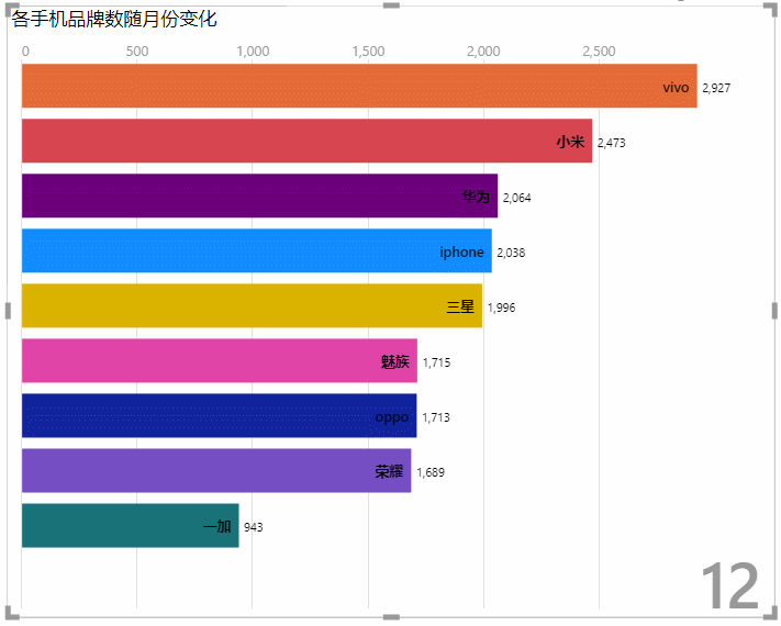还有Animated Bar Chart Race可以动态演示数据达成,这里动态演示不同月份手机品牌数的动态变化,PowerBI软件所有的视觉对象都是内置的,使用起来轻松、方便。