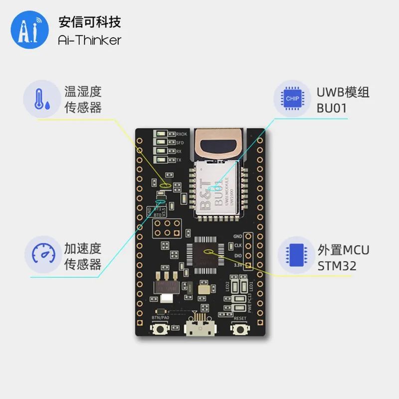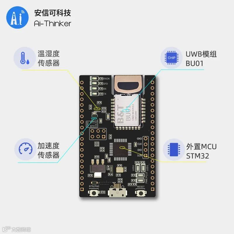 ②高度集成。核心模组BU01是基于 Decawave 的 DW1000 设计的超宽带(UWB)收发器模组,集成了天线,射频电路,电源管理和时钟电路。