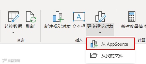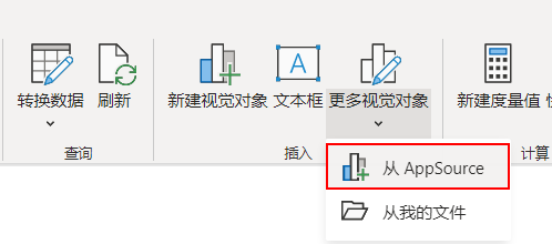 除此之外,还可以在AppSource Power BI中导入视觉对象,点击插入更多视觉对象,选择从AppSource。
