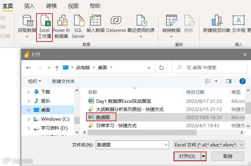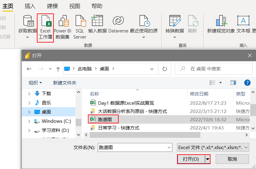 打开PowerBI软件,点击主页中的Excel工作簿,在路径中导入本次整理的数据源数据,点击打开。