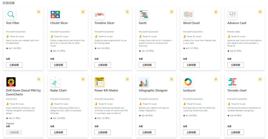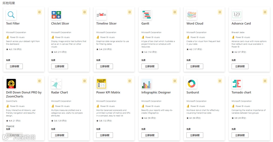 需要注册登录后发现AppSource中有百余种不同的视觉对象可以使用。