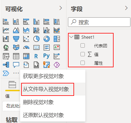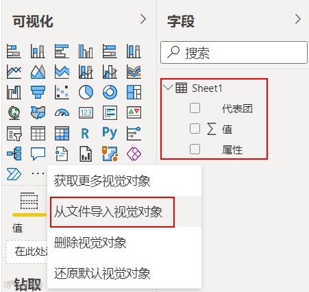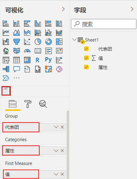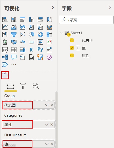 导入视觉可视化对象以后,可以在下面发现导入的小图标,点击该小图标,将代表团拖入到Group,将属性拖入到Categories,将值拖入到First Measure。