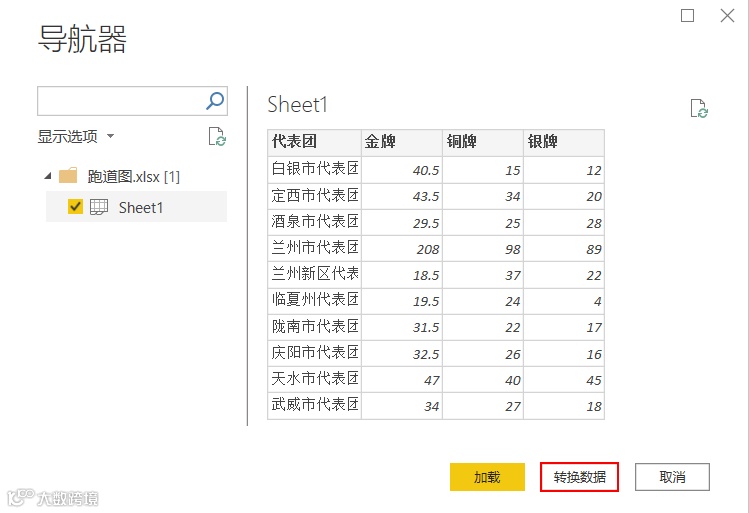 在导航器中勾选Sheet1表,点击转换数据进行数据预处理。